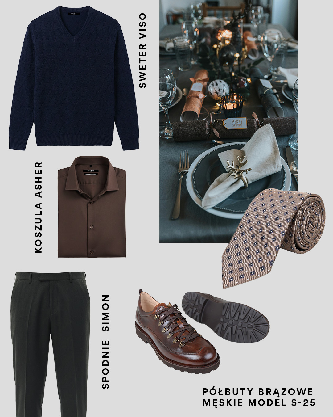 Do granatowego swetra dobraliśmy, brązową koszulę, ciemnozielone spodnie i buty inspirowane stylem górskim. Całość uzupełnia krawat w odcieniach brązu.