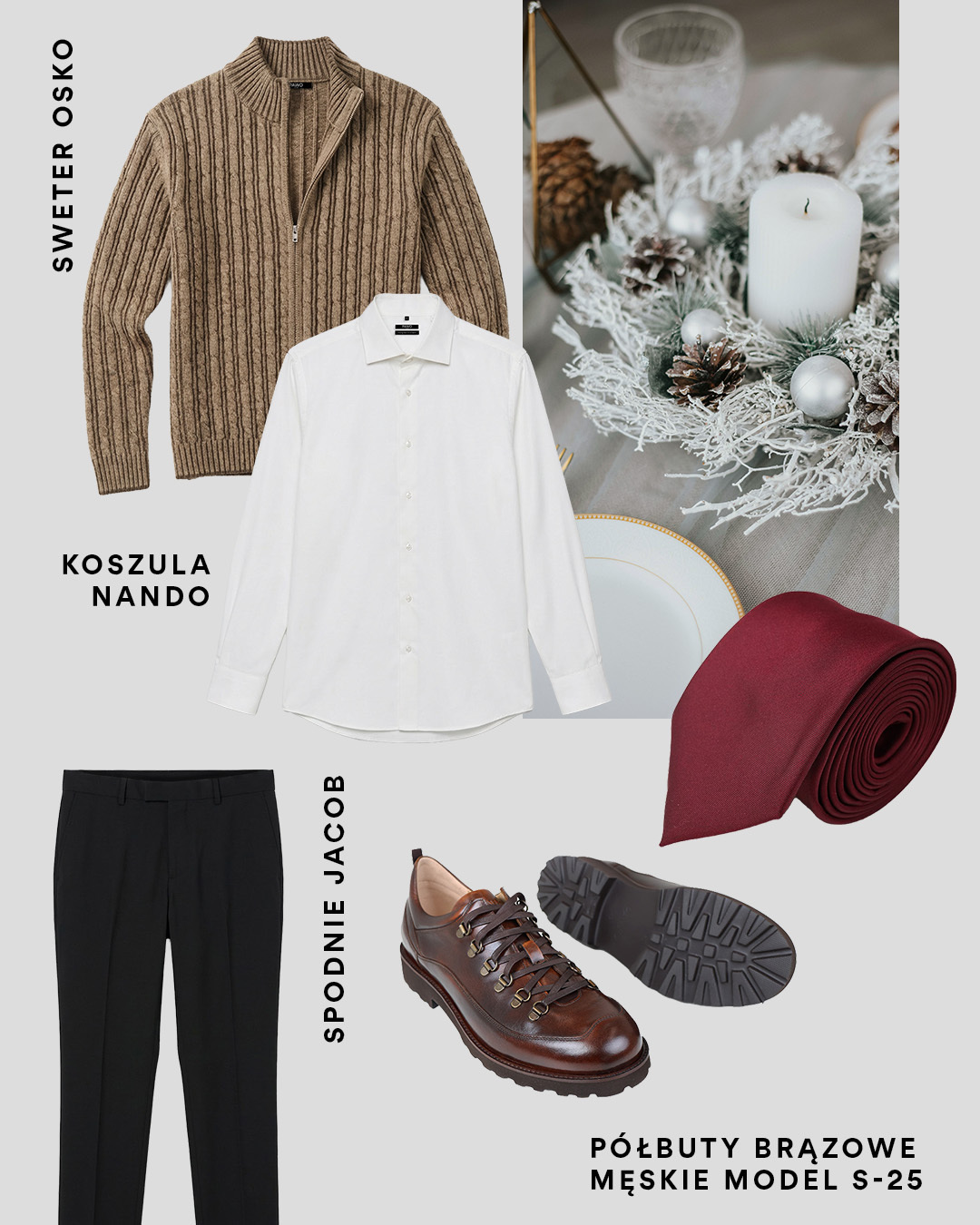 W tej stylizacji znajdziesz nasz bestsellerowy kardigan OSKO z wełny merino o grubszym splocie. Do tego biała koszula, spodnie od garnituru Jacob i buty inspirowane stylem górskim. Całość uzupełnia bordowy krawat.