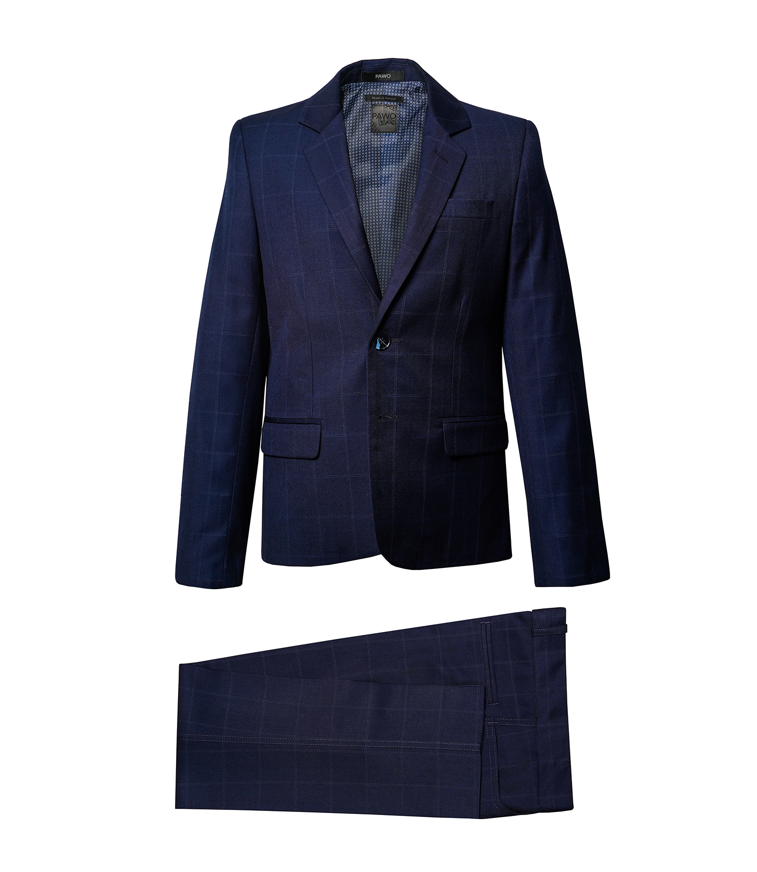 Granatowy garnitur chłopięcy uszyty z granatowej tkaniny odpornej na zagniecenia. Garniturek chłopięcy idealny na uroczystość komunijną. Garnitur posiada modny wzór w kratkę, która sprawia, że młody mężczyzna wygląda...