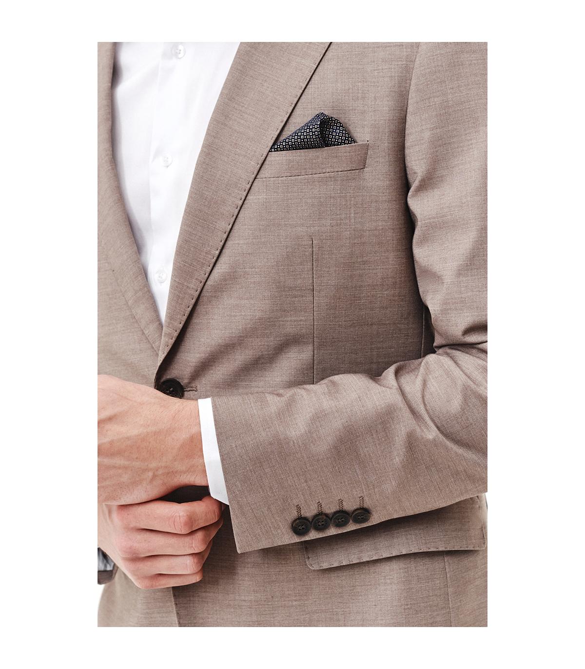 Marynarka NADO posiada zamknięte klapy ze stębnowaniem AMF – detalem świadczącym o starannym odszyciu i wyższym standardzie wykonania. Klasyczne kieszenie z patkami oraz dwie szlice z tyłu nadają jej funkcjonalności i wygody. To marynarka, która świetnie sprawdzi się zarówno w stylizacjach smart casualowych z gładkimi koszulami lub golfami.