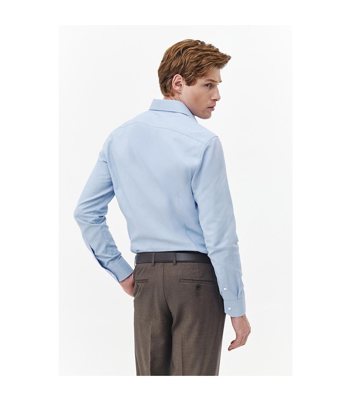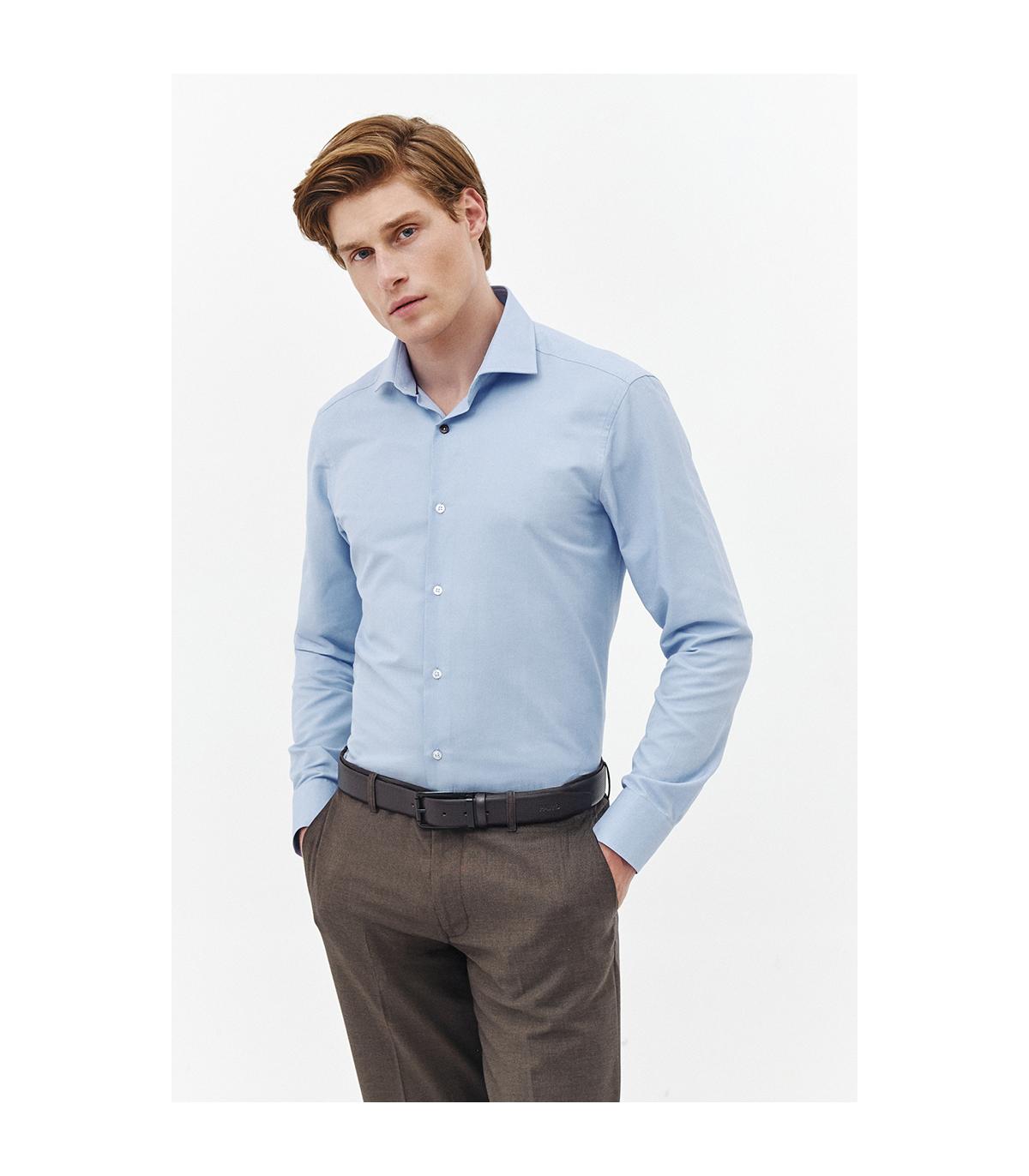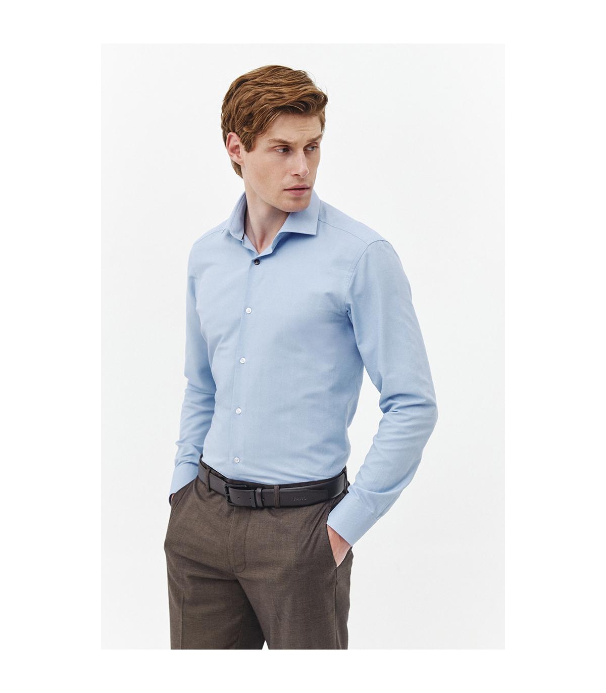 Klasyczna koszula męska uszyta z błękitnej tkaniny o drobnej strukturze.