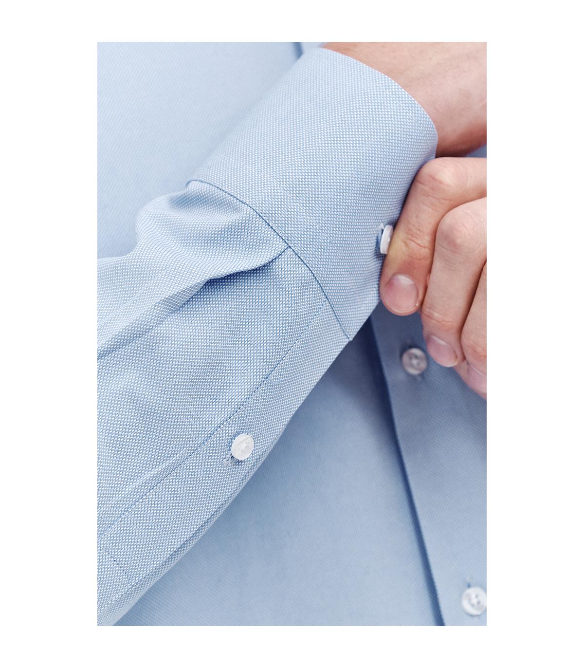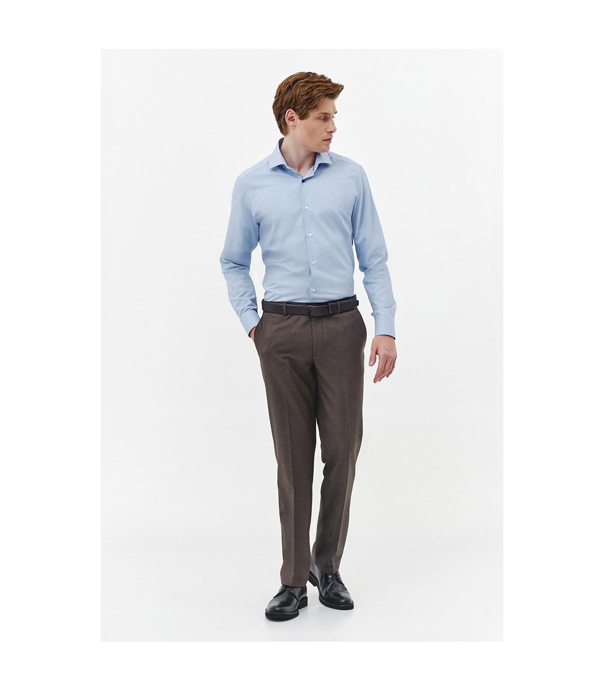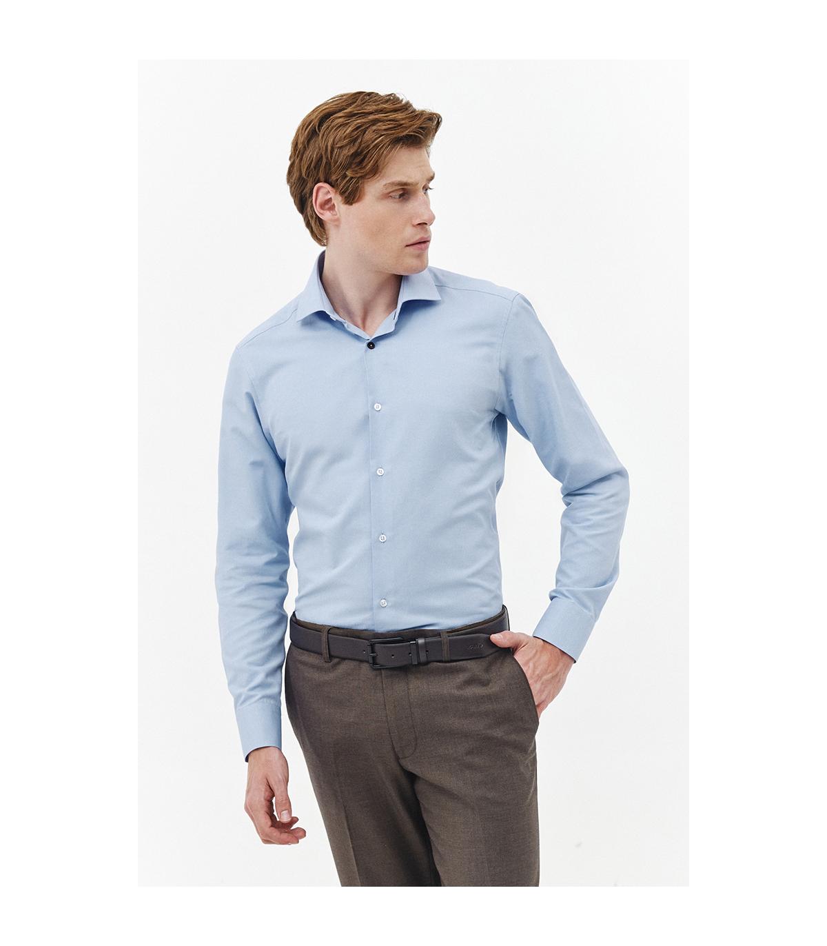 Klasyczna koszula męska uszyta z błękitnej tkaniny o drobnej strukturze.