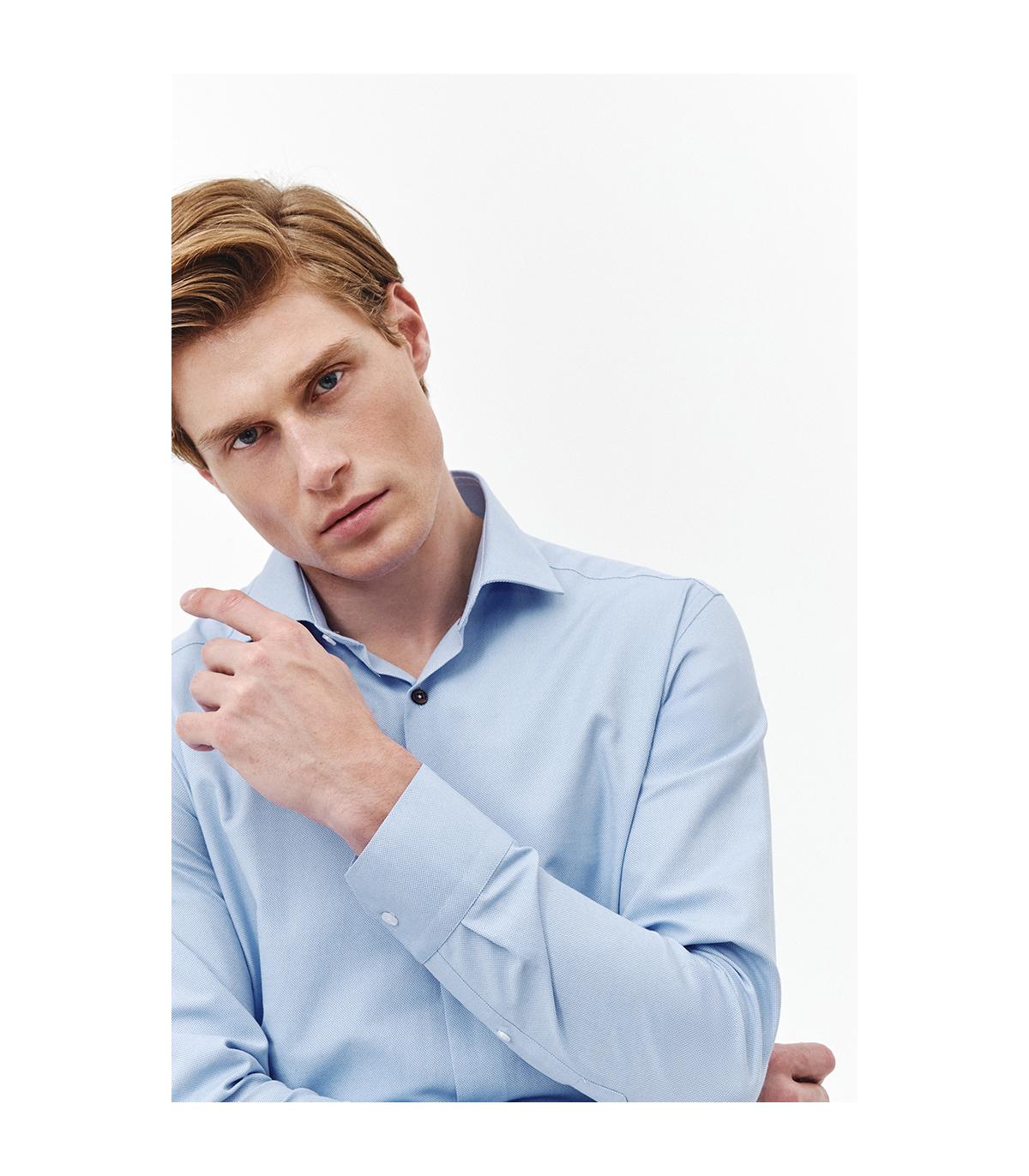 Klasyczna koszula męska uszyta z błękitnej tkaniny o drobnej strukturze. Skład tkaniny zapewnia wysoki komfort użytkowania. Posiada kołnierz włoski oraz taliowany krój. W stójkę kołnierza wszyto ozdobną, granatową wypustkę. Koszula Emek przeznaczona jest jako całodzienna do pracy w biurze, na biznesowe spotkania oraz na wyjścia do klubów. Najlepiej prezentuje się z granatowymi, szarymi garniturami i z ciemnym krawatem.