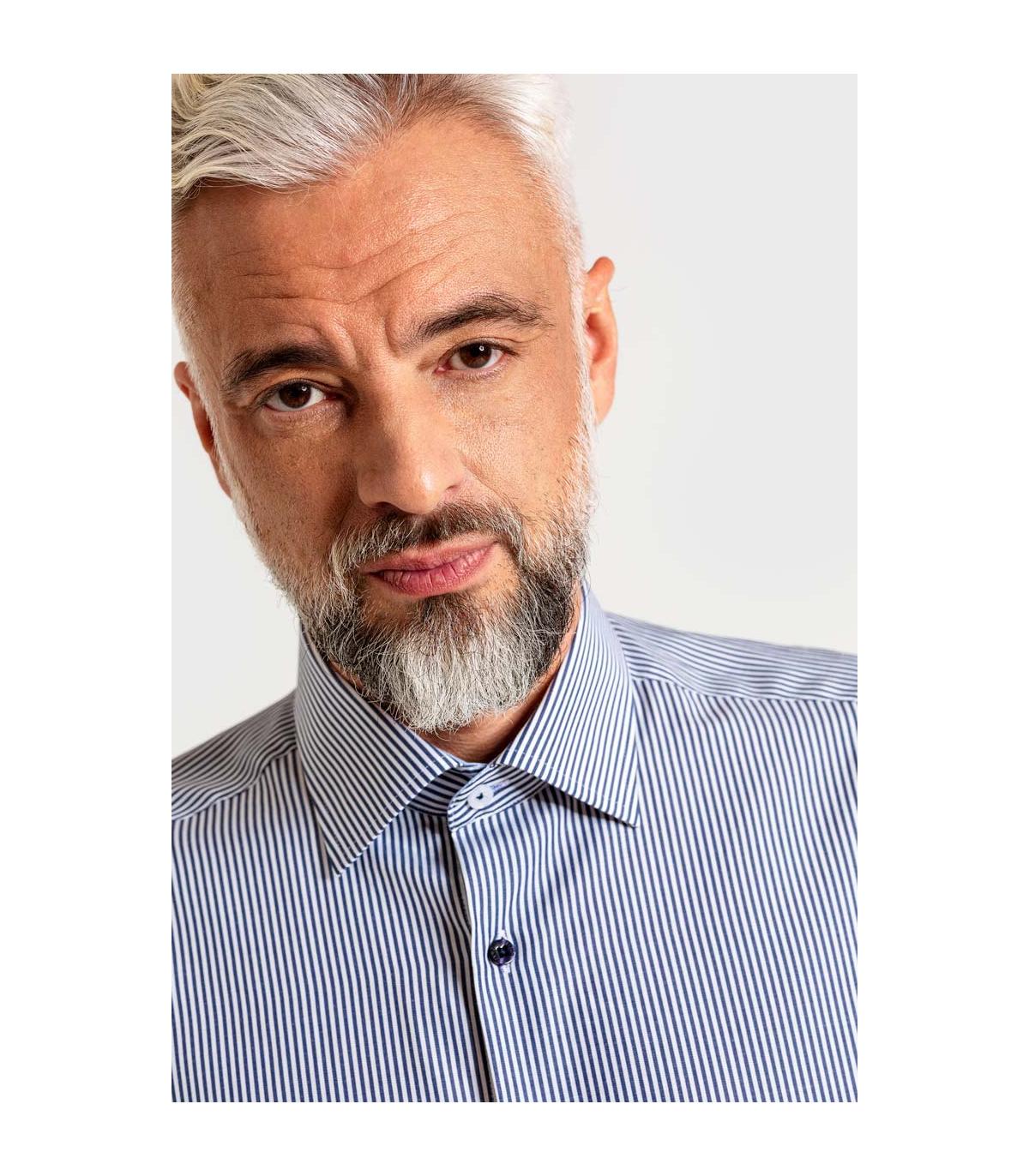 Elegancka koszula męska w drobne paski w kolorze granatowym. Koszula uszyta z tkaniny bawełnianej z dodatkiem poliestru, który wzmacnia tkaninę i przedłuża jej trwałość oraz zwiększa odporność na zagniecenia. Ta koszula to świetna propozycja na wiele okazji, można połączyć ja z klasycznym garniturem jak i wersji casualowej z marynarką czy dzianinową kamizelka i spodniami typu chinos czy jeansami. Koszula świetnie nadaje się na prezent świąteczny czy tez do stylizacji na święta, uniwersalny i zawsze modny wzór pasków, kołnierzyk klasyczny to propozycja dla mężczyzny w każdym wieku.