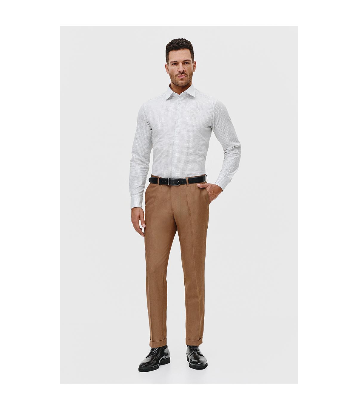 Wzór koszuli z drobnymi trójkątami w granatowym i miodowym kolorze sprawia, że ta koszula jest uniwersalna i pasuje do stylizacji każdego mężczyzny, niezależnie od wieku i pory roku. Koszula idealnie komponuje się z granatowym garniturem lub marynarką, dodając elegancji i wyrafinowania Twojemu wyglądowi. Możesz także nosić ją samodzielnie, łącząc z klasycznymi spodniami w kant lub casualowymi. Świetnie pasuje zarówno do klasycznych jeansów, jak i brązowych chinosów, nadając Twojej stylizacji wyjątkowego charakteru. Dodatkowo, biała koszula męska doskonale łączy się z brązowym garniturem Belfast, tworząc kompleksową i elegancką stylizację na różne okazje. Ten zestaw dodaje Twojemu wyglądowi wyjątkowej klasy i z pewnością przyciągnie pozytywne spojrzenia.