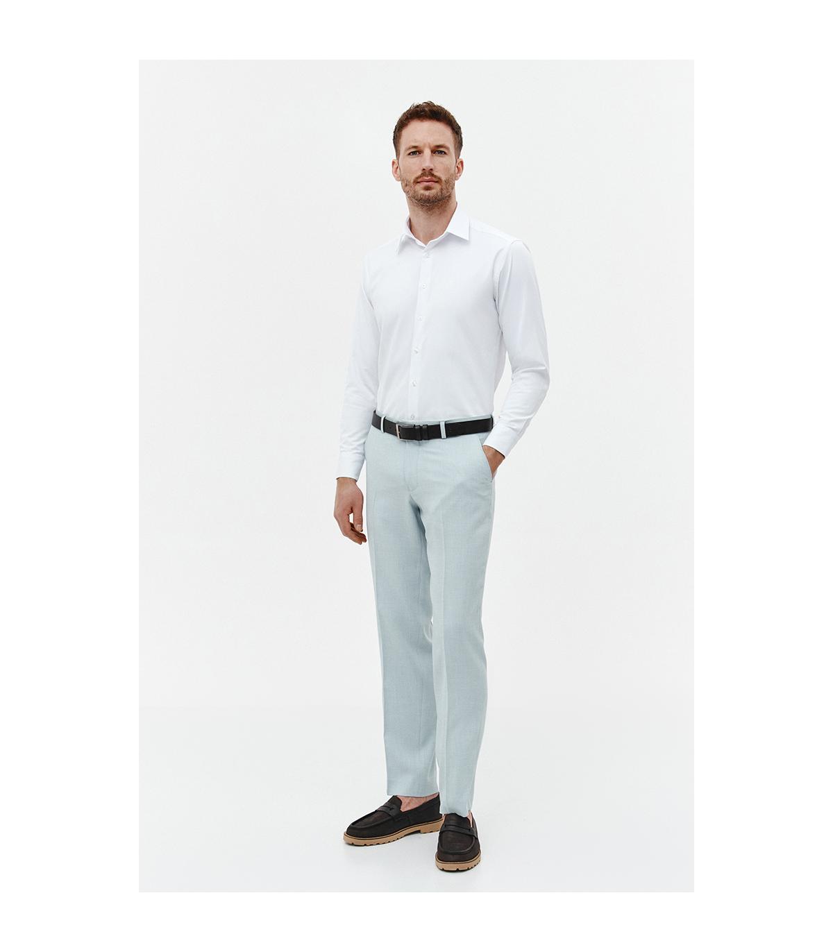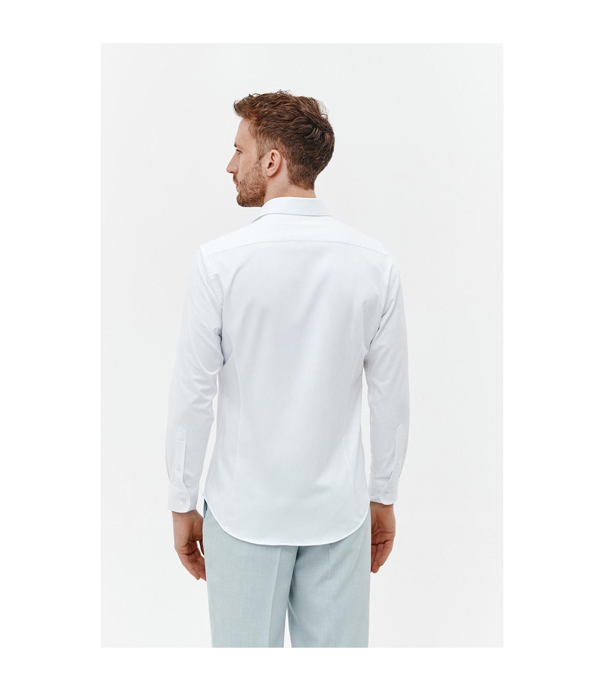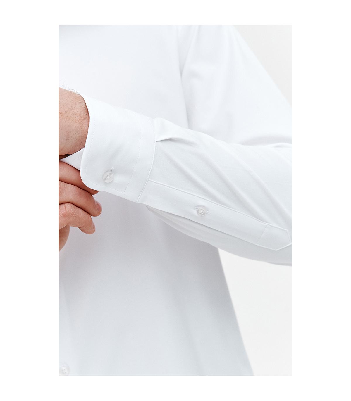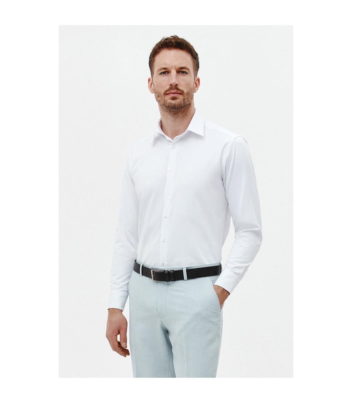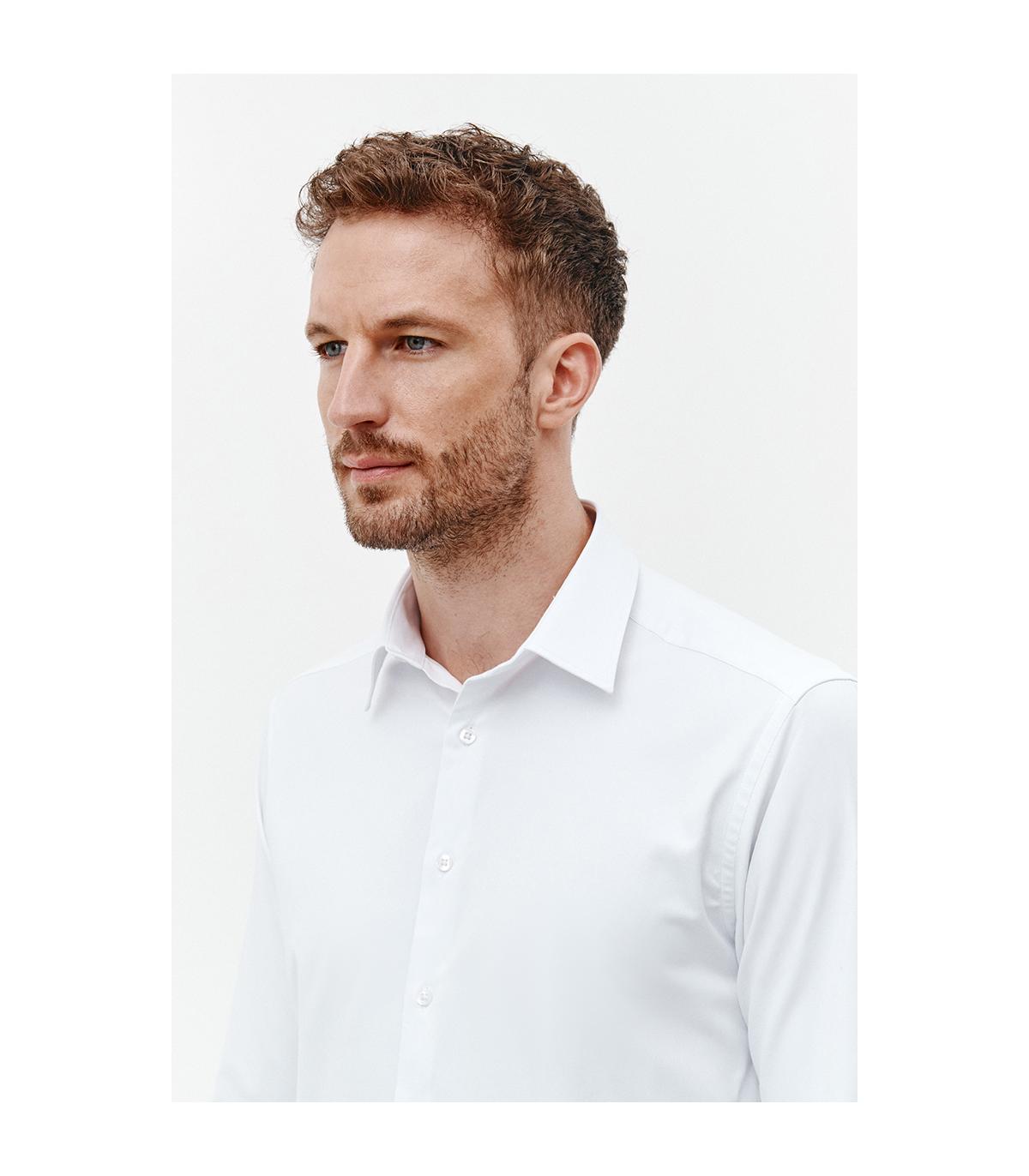 Koszula męska JOHN to ponadczasowa, biała koszula, która sprawdzi się zarówno w formalnych, jak i mniej zobowiązujących stylizacjach. Wykonana z gładkiej tkaniny o składzie 48% bawełna, 46% poliester i 6% elastan, łączy w sobie elegancję, funkcjonalność i wysoki komfort noszenia. Kołnierzyk typu kent i zaokrąglone mankiety nadają jej klasyczny charakter, a dodatek elastanu sprawia, że koszula świetnie dopasowuje się do sylwetki.