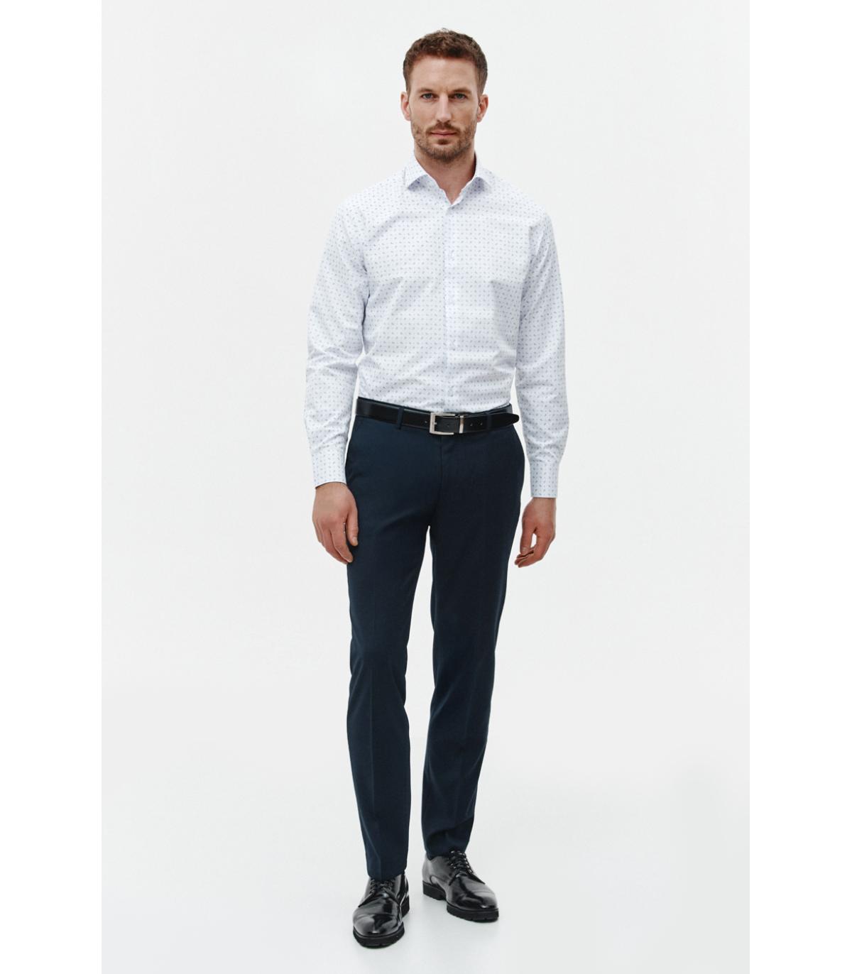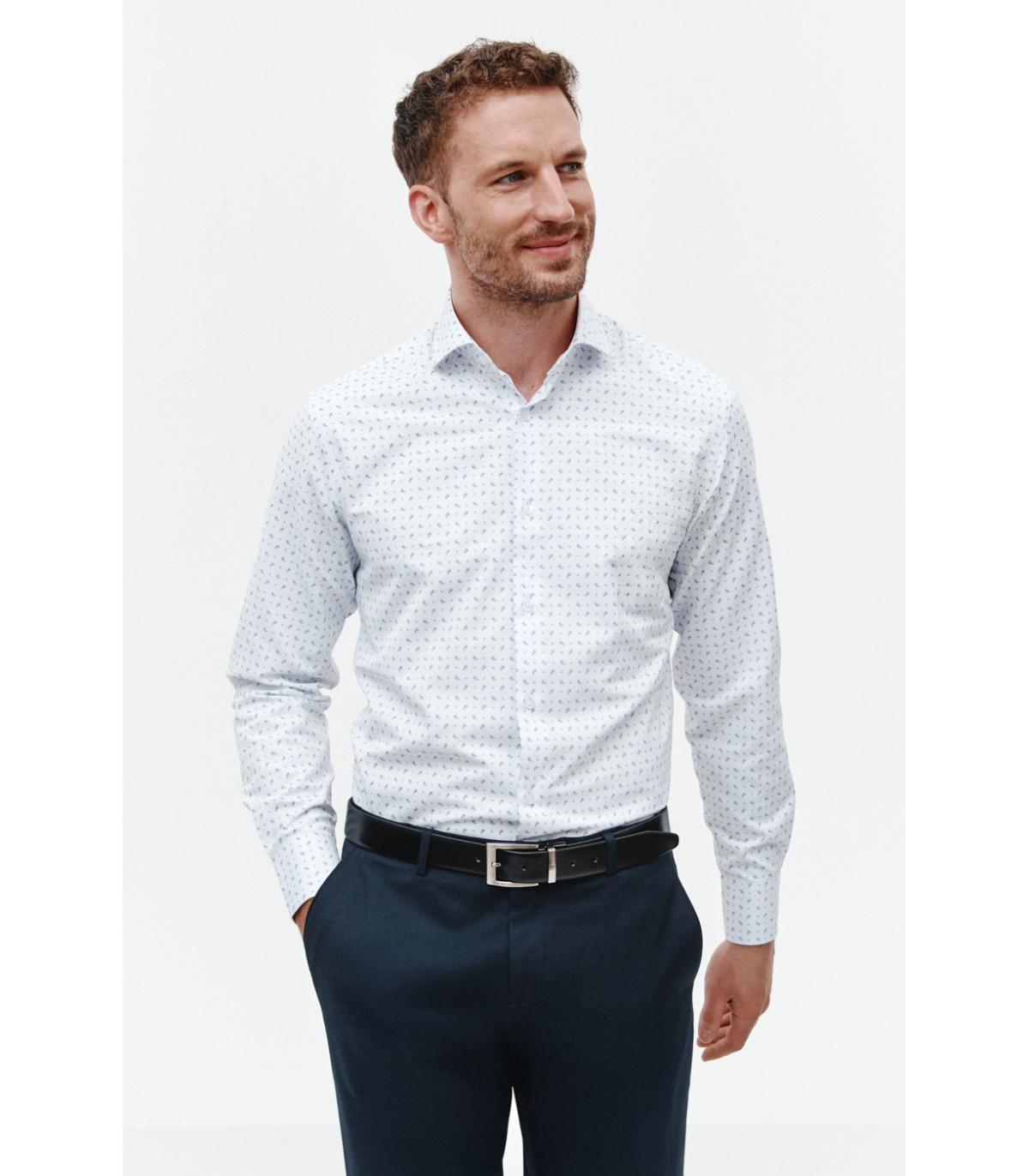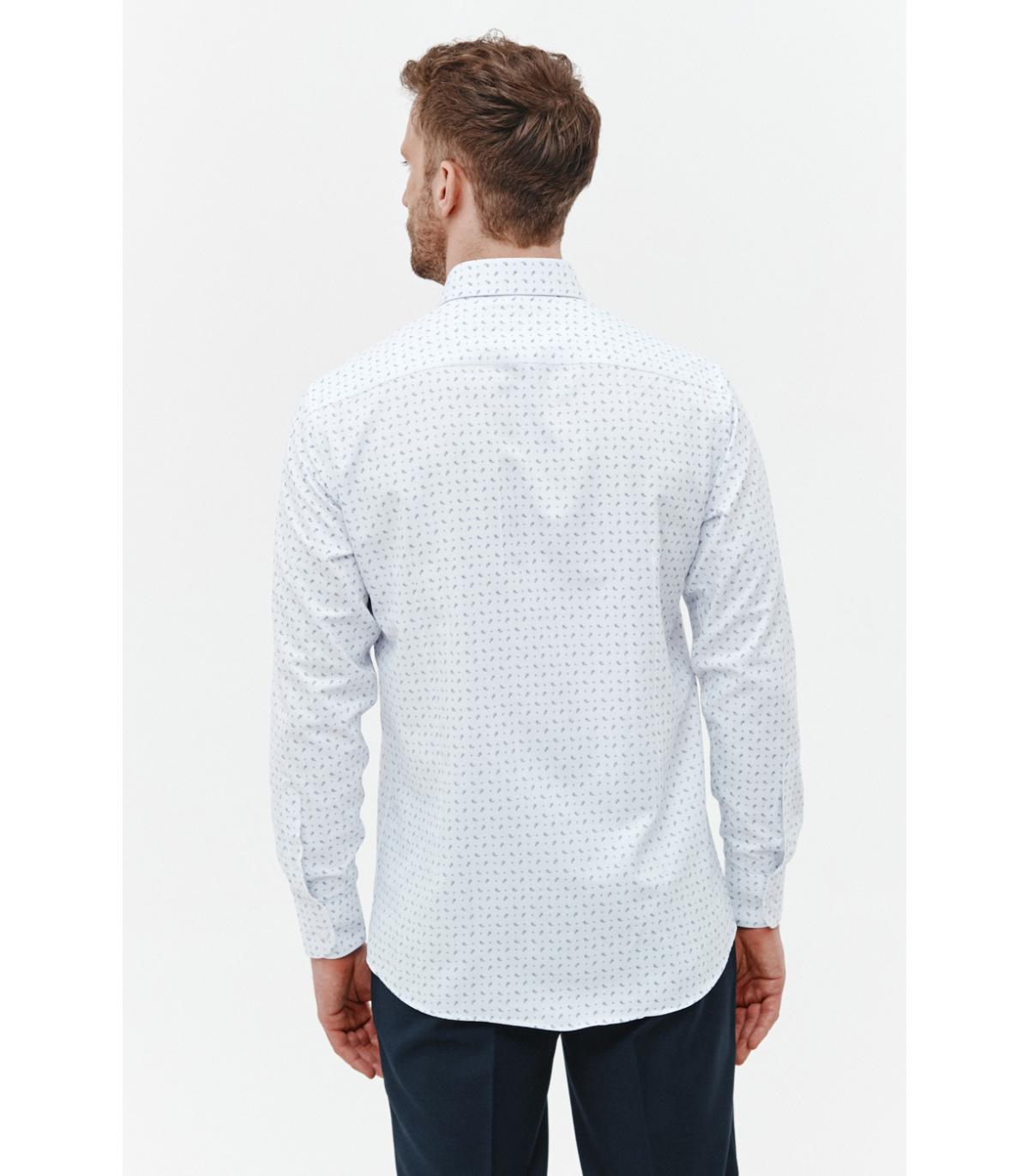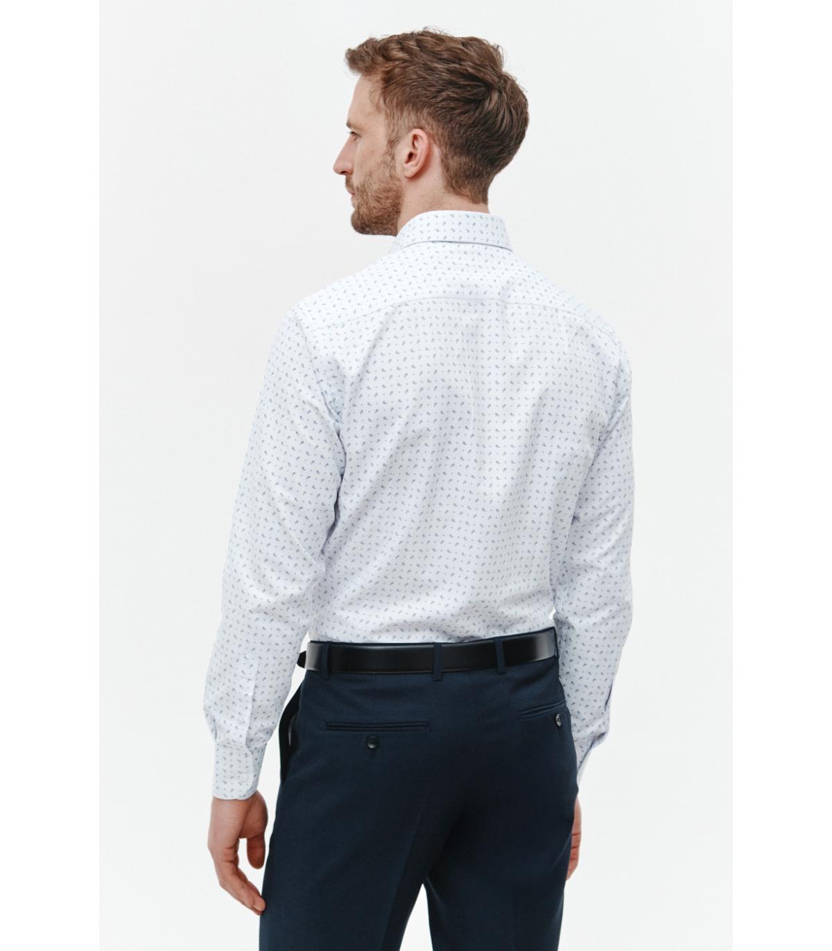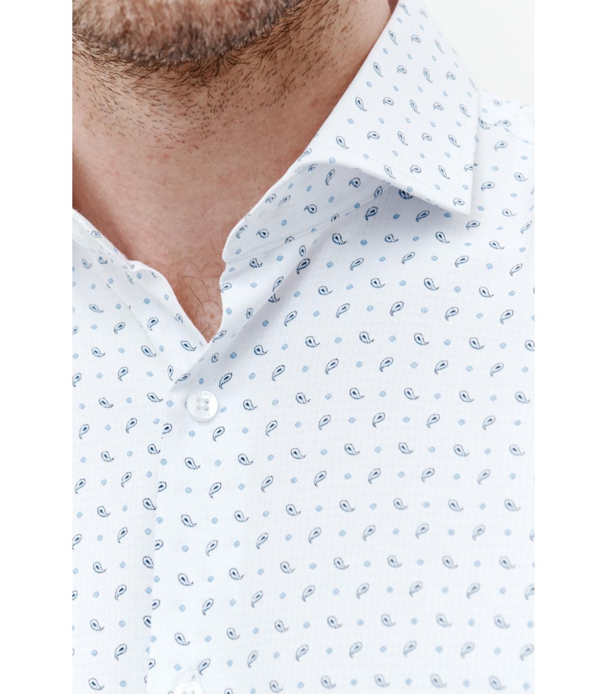 Biała Tkanina Strukturalna z Mikrowzorem Paisley – elegancka tkanina o delikatnej strukturze została ozdobiona subtelnym nadrukiem w odcieniach granatu i niebieskiego, co nadaje koszuli unikalnego charakteru, nie odbierając jej formalnego wyglądu.