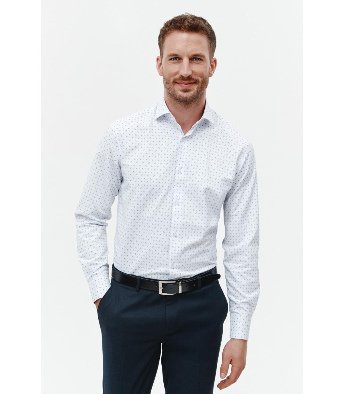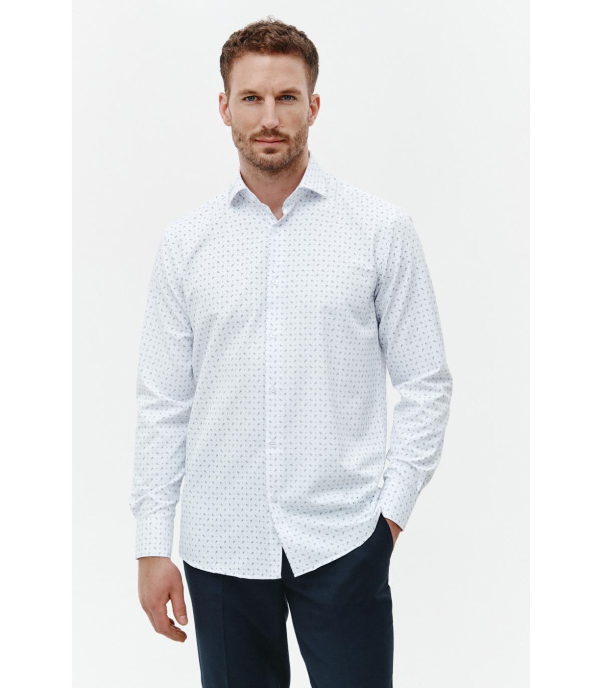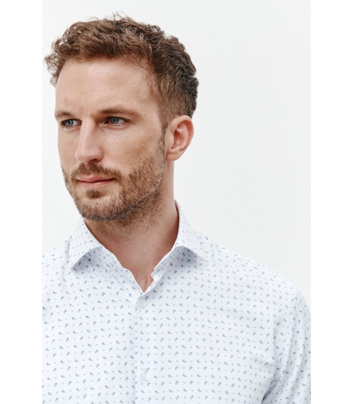 Biała Tkanina Strukturalna z Mikrowzorem Paisley – elegancka tkanina o delikatnej strukturze została ozdobiona subtelnym nadrukiem w odcieniach granatu i niebieskiego, co nadaje koszuli unikalnego charakteru, nie odbierając jej formalnego wyglądu.