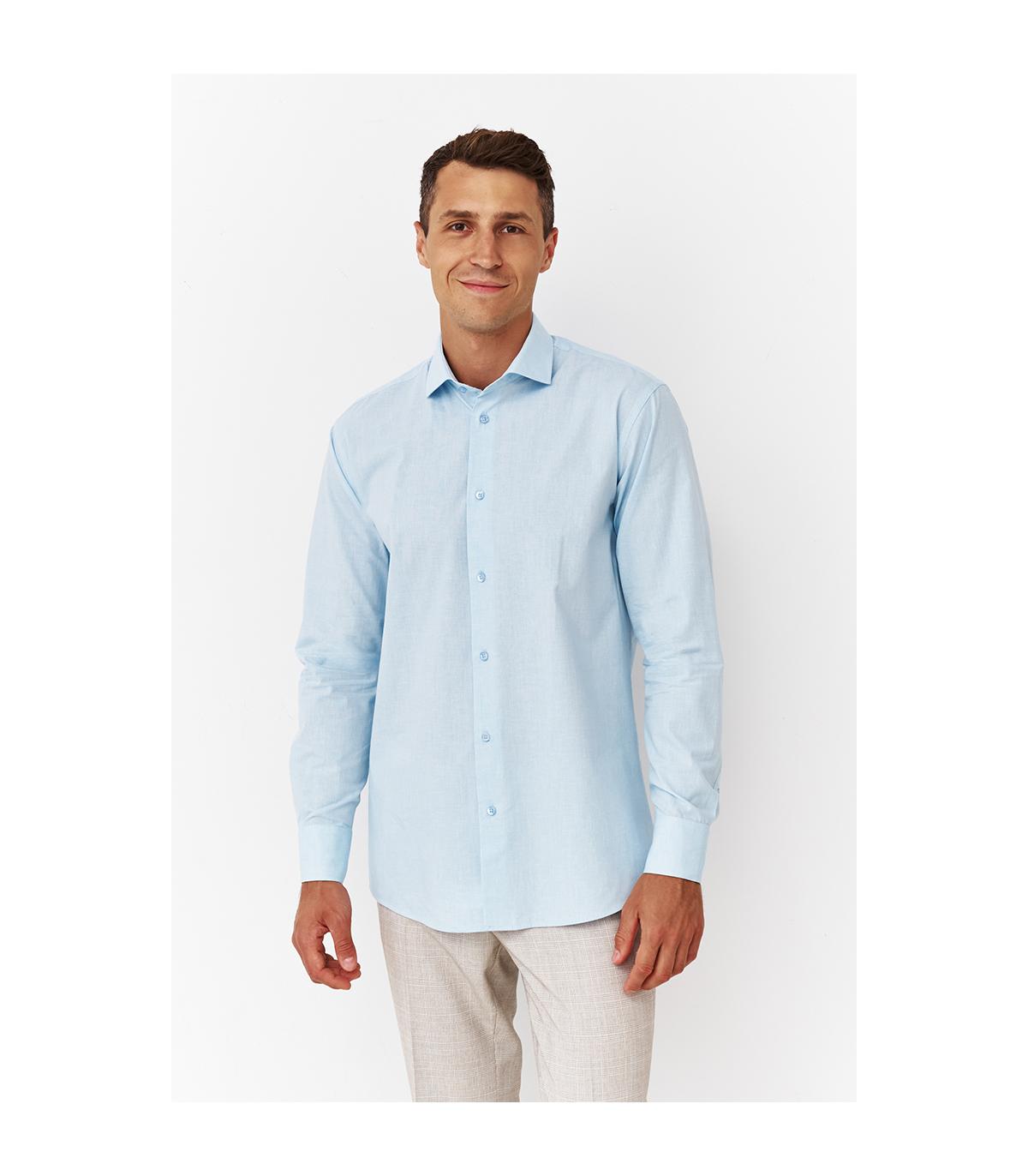 Męska koszula w jasnobłękitnym kolorze z wyraźnym, nieregularnym splotem białych i błękitnych włókien to propozycja łącząca elegancję z letnią lekkością. Uszyta została z 100% bawełny, a faktura tkaniny przywodzi na myśl lniany splot, co sprawia, że świetnie sprawdza się szczególnie w cieplejszych miesiącach.