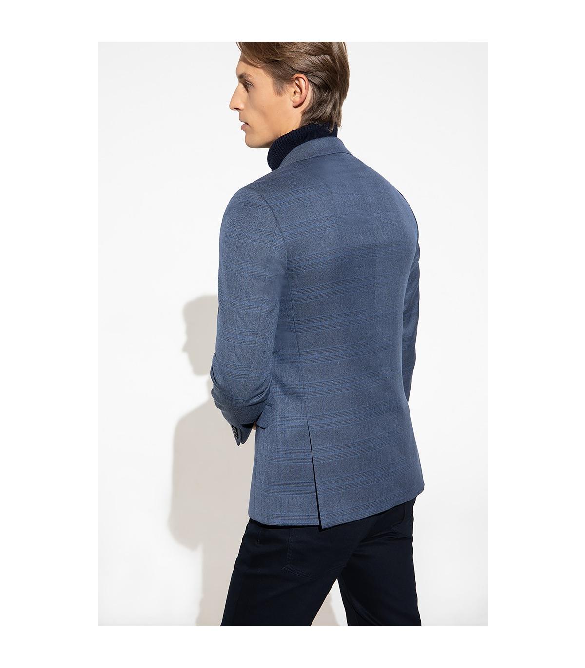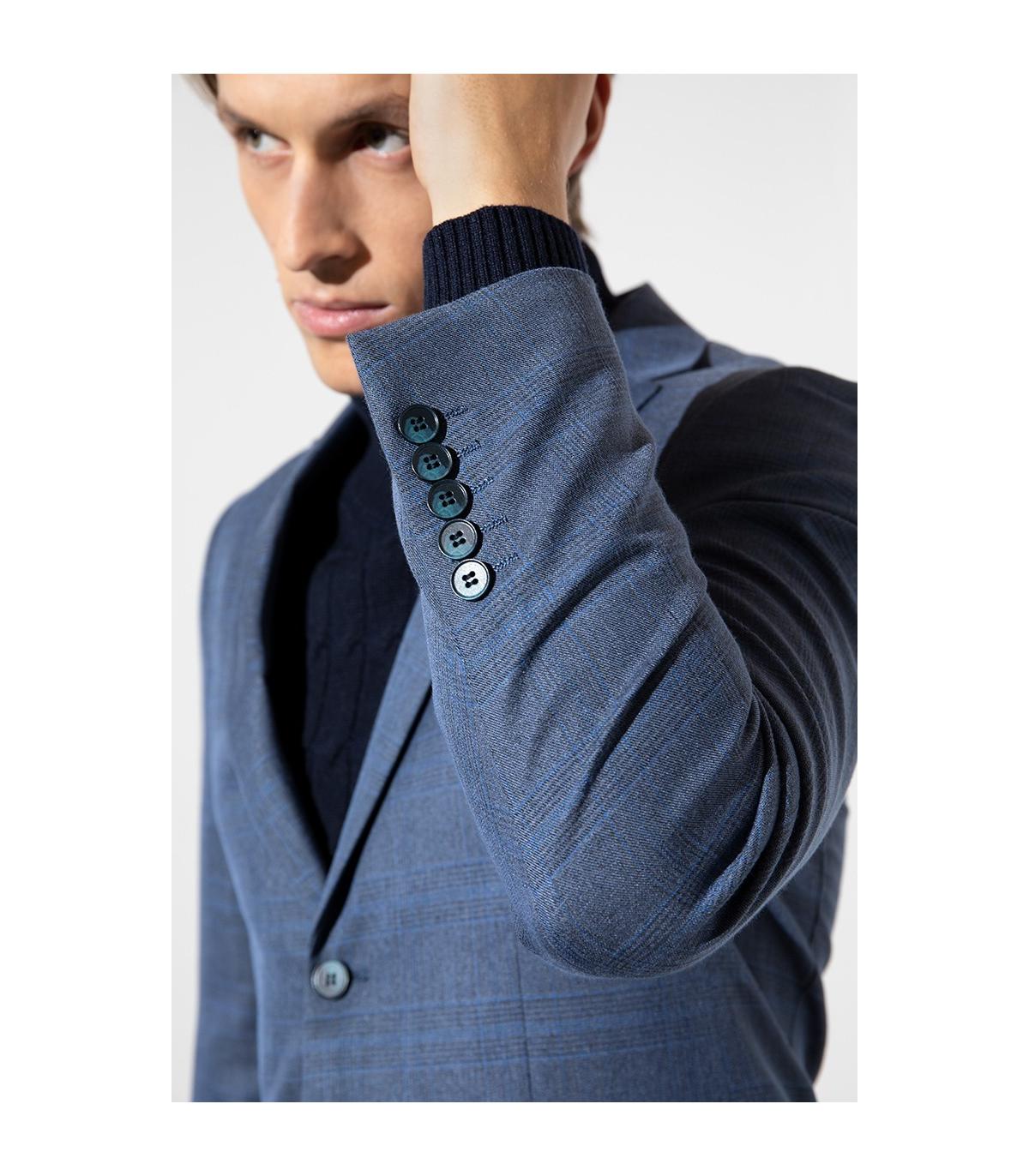 Marynarka męska w kolorze zgaszonego granatu z szarością w kartkę. Poliwiskoza wysokiej jakości sprawia, że atrakcyjnie układa się na sylwetce i jest komfortowy. Tradycyjnie wytaliowana marynarka jest jednorzędowa, zapinana na dwa guziki czarno-niebieskie. Klapy marynarki są otwarte, z tyłu dwa rozcięcia, kieszenie proste, cięte z patkami.
