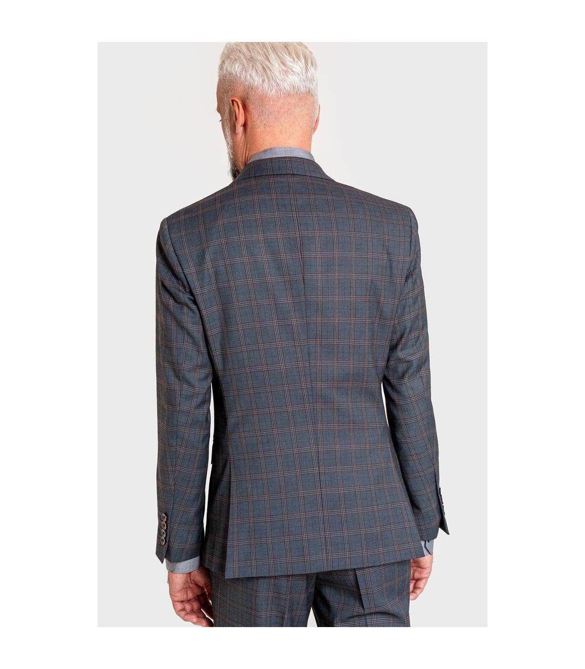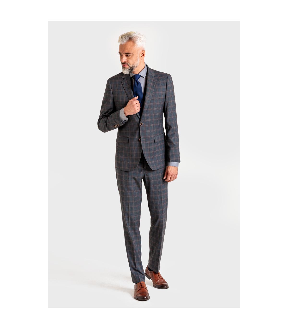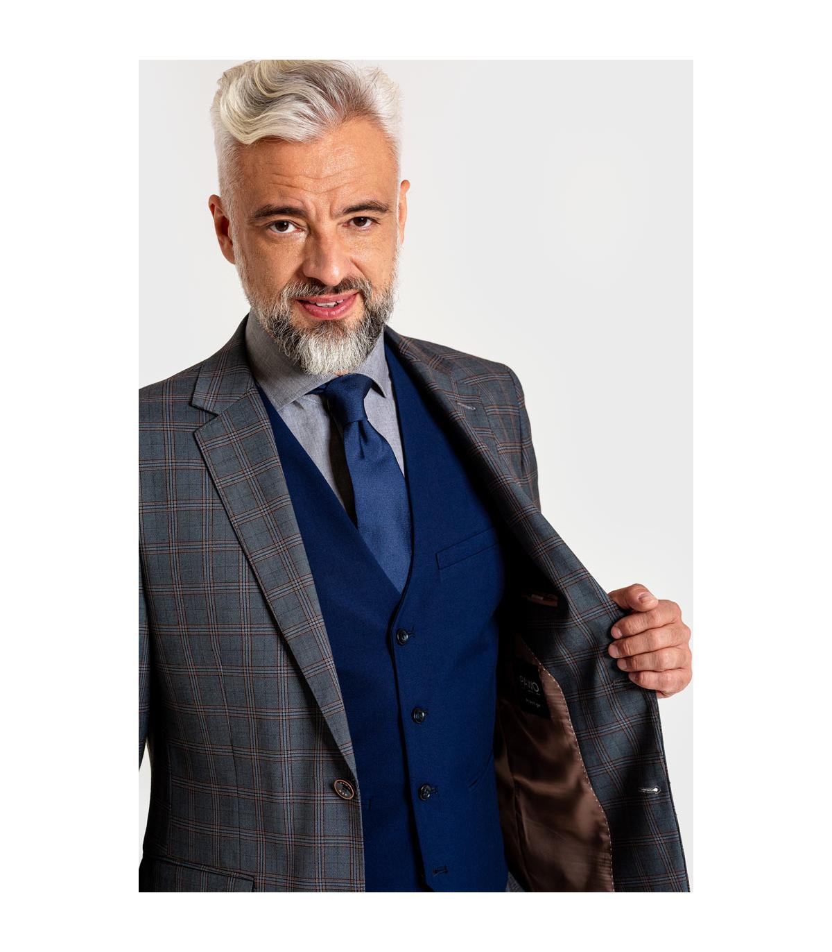 Elegancka klasyczna marynarka męska w kolorze szarym w brązową kratkę. Marynarka uszyta z tkaniny odpornej na zagniecenia z dodatkiem elastanu, który zwiększa komfort dopasowania produktu. Marynarka posiada klasyczne szerokie klapy, dwa rozcięcia z tyłu oraz desinerskie guziki sygnowane PAWO MEN. Wnętrze marynarki wyściełane piękną gładką podszewką w brązowym kolorze. Do marynarki można dokupić spodnie Goya i stworzyć klasyczny garnitur.