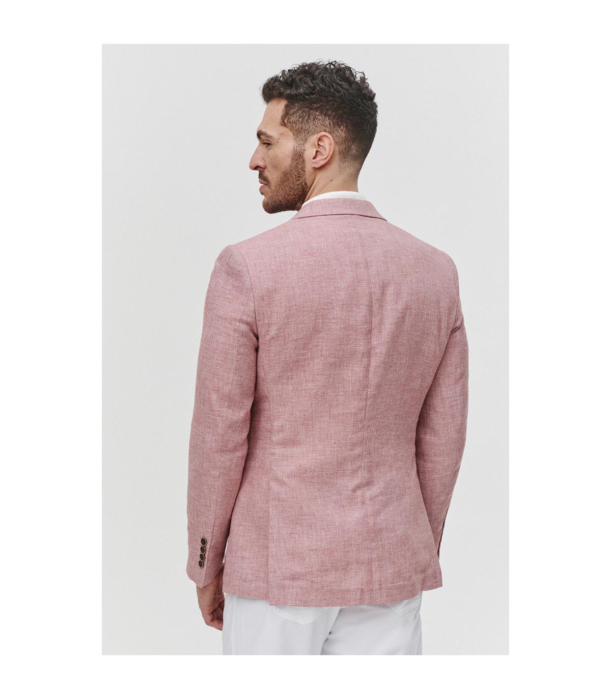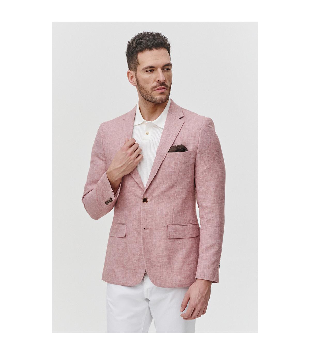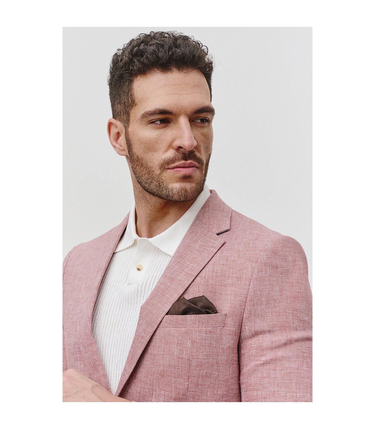 Marynarka męska CANNOCK to idealny wybór na letnie dni, oferujący nie tylko styl, ale także wygodę. Ta letnia marynarka w kolorze terracotty przełamanej bielą jest elegancka, a jednocześnie w pełni nadaje się na casualowe okazje. Uszyta na półpodszewce w łososiowym kolorze, marynarka jest wykonana z mieszanki tkaniny z 30% lnu i 70% poliestru. Widoczny splot tkaniny podkreśla jej luźny i nieformalny charakter, dodając stylu całej stylizacji. Naturalny dodatek lnu sprawia, że marynarka jest lekka i przewiewna, doskonała na ciepłe i upalne dni. Możesz ją zestawić z białą koszulą dla klasycznego i eleganckiego wyglądu, lub połączyć z odcieniami terracotty i brzoskwini dla bardziej świeżego i letniego looku.