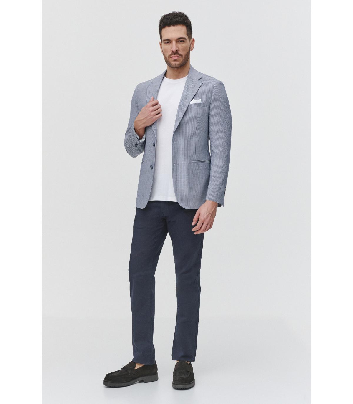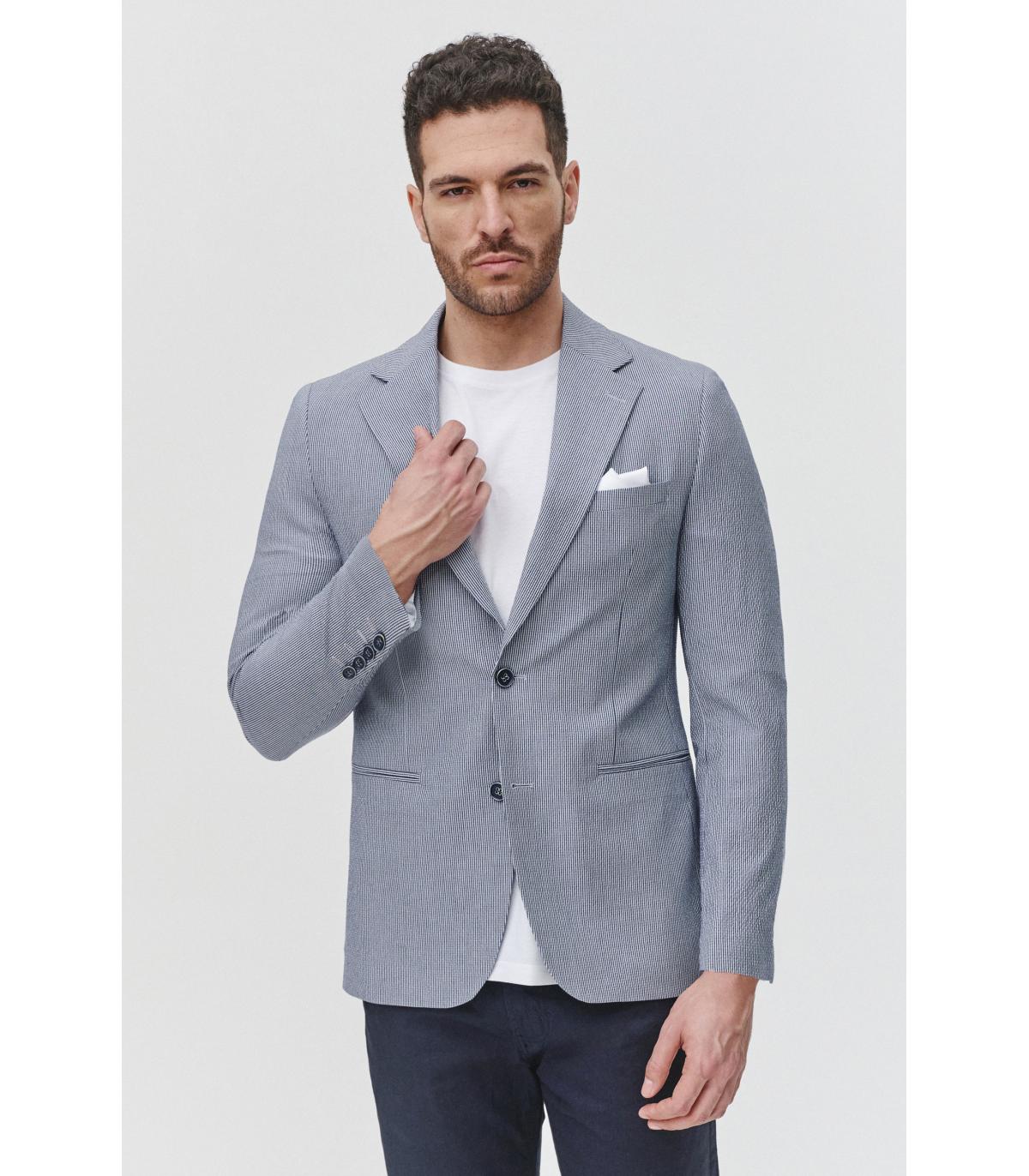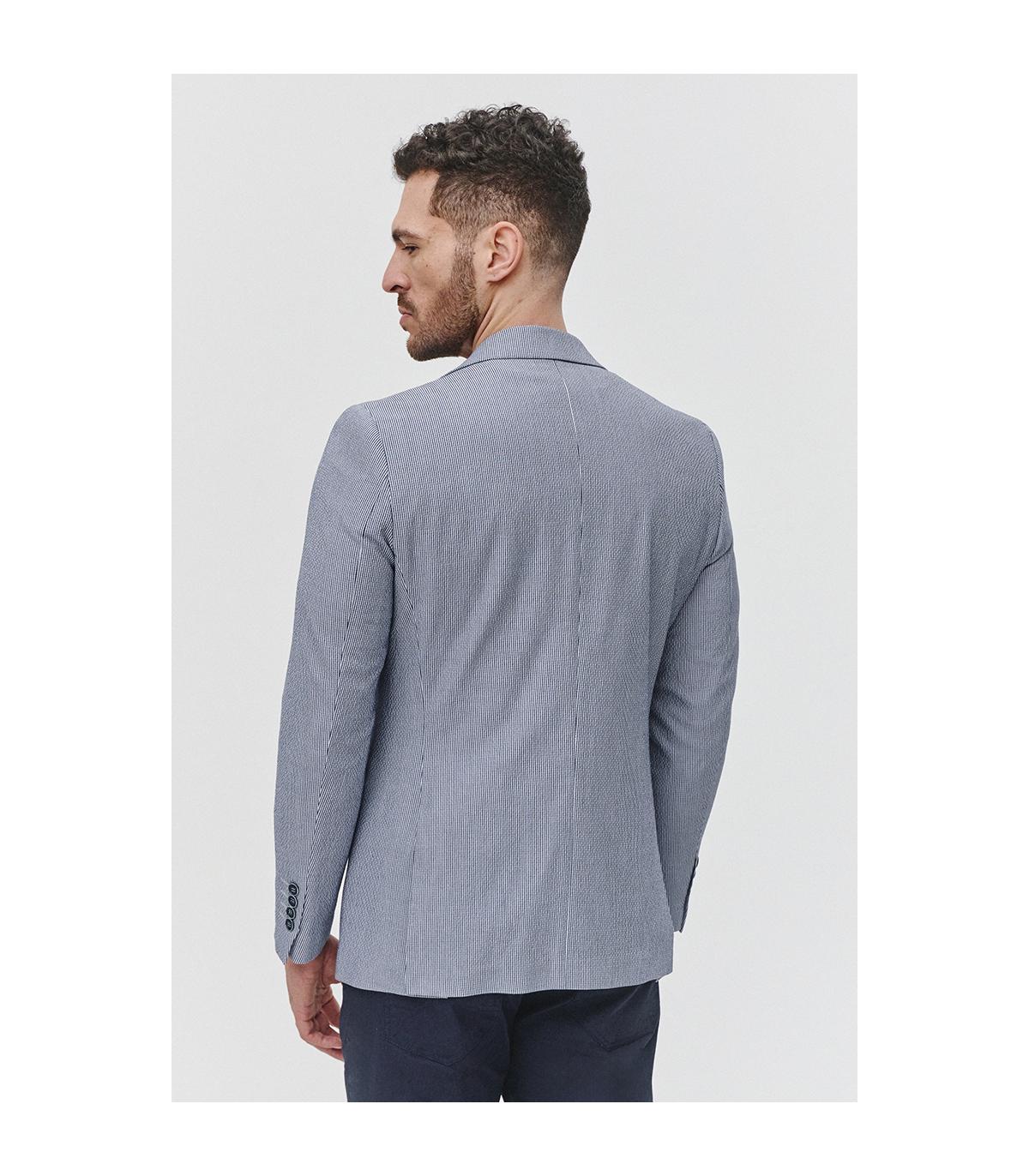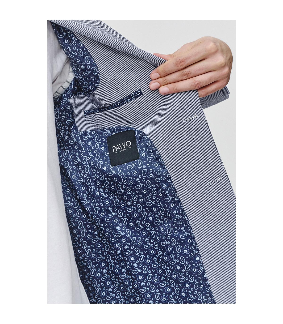 Letnia marynarka BLACKPOOL, która jest idealnym dodatkiem do Twojej garderoby. Ta marynarka została wykonana z wysokiej jakości tkaniny o delikatnej strukturze, ozdobionej drobnymi granatowymi paskami. Marynarka BLACKPOOL jest uszyta z dbałością o detale i wykonana na półpodszewce, co sprawia, że jest wygodna w noszeniu nawet podczas ciepłych dni. Skład materiału to 66% poliester, 31% wiskoza i 3% spandex, co zapewnia nie tylko trwałość, ale także elastyczność, dopasowując się do Twoich ruchów. Ta marynarka ma nieco szersze klapy, co nadaje jej unikalnego charakteru i nowoczesnego wyglądu. Kieszenie odszyte pliskami dodają elegancji, a brak patek i dwie szlice nadają jej lekkości i swobodnego stylu.