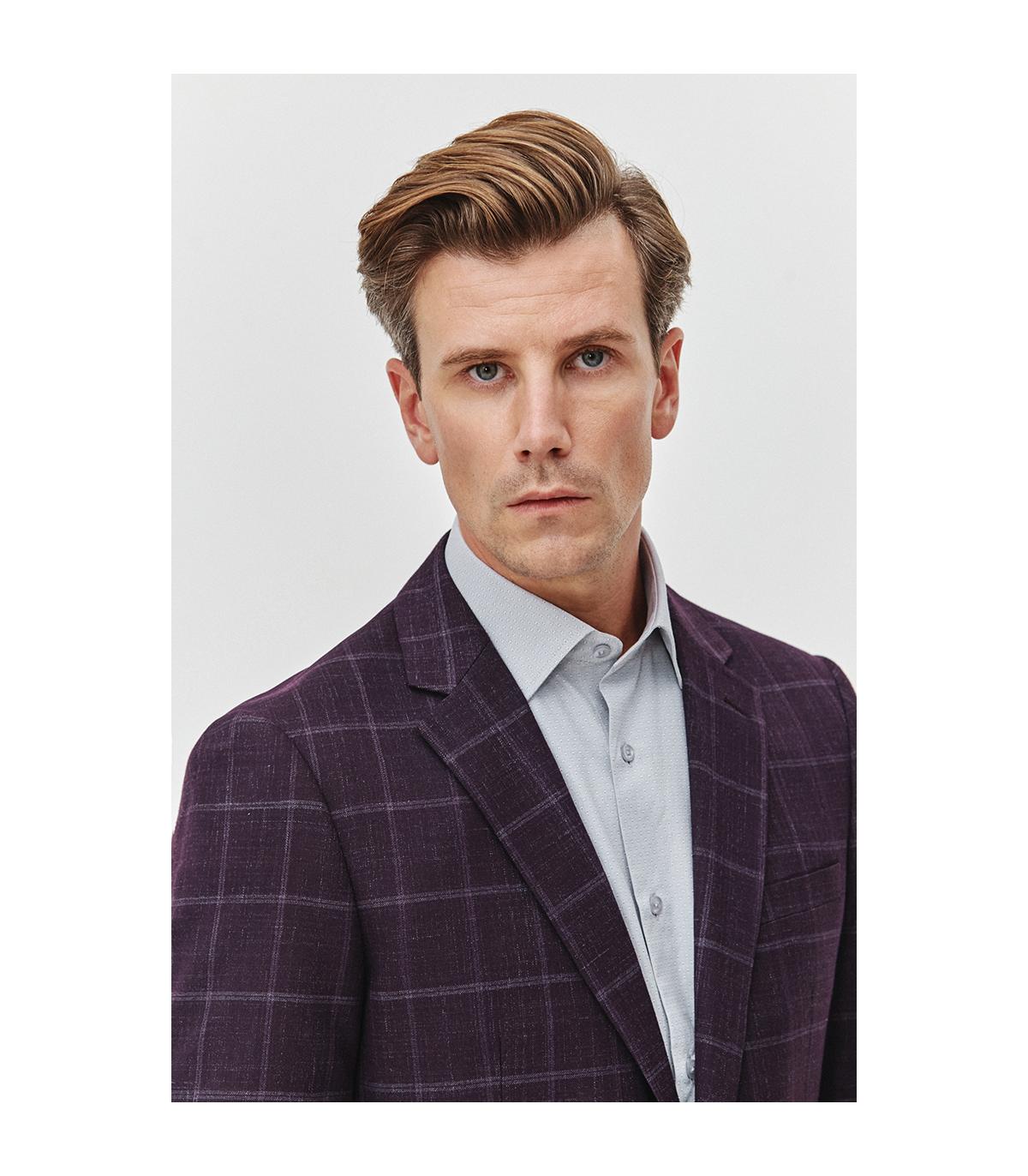 Elegancka, jasno szara koszula męska z subtelnym, geometrycznym wzorem żakardowym, który dodaje jej wyjątkowego charakteru. Wykonana z mieszanki bawełny i poliestru, oferuje zarówno komfort noszenia, jak i...