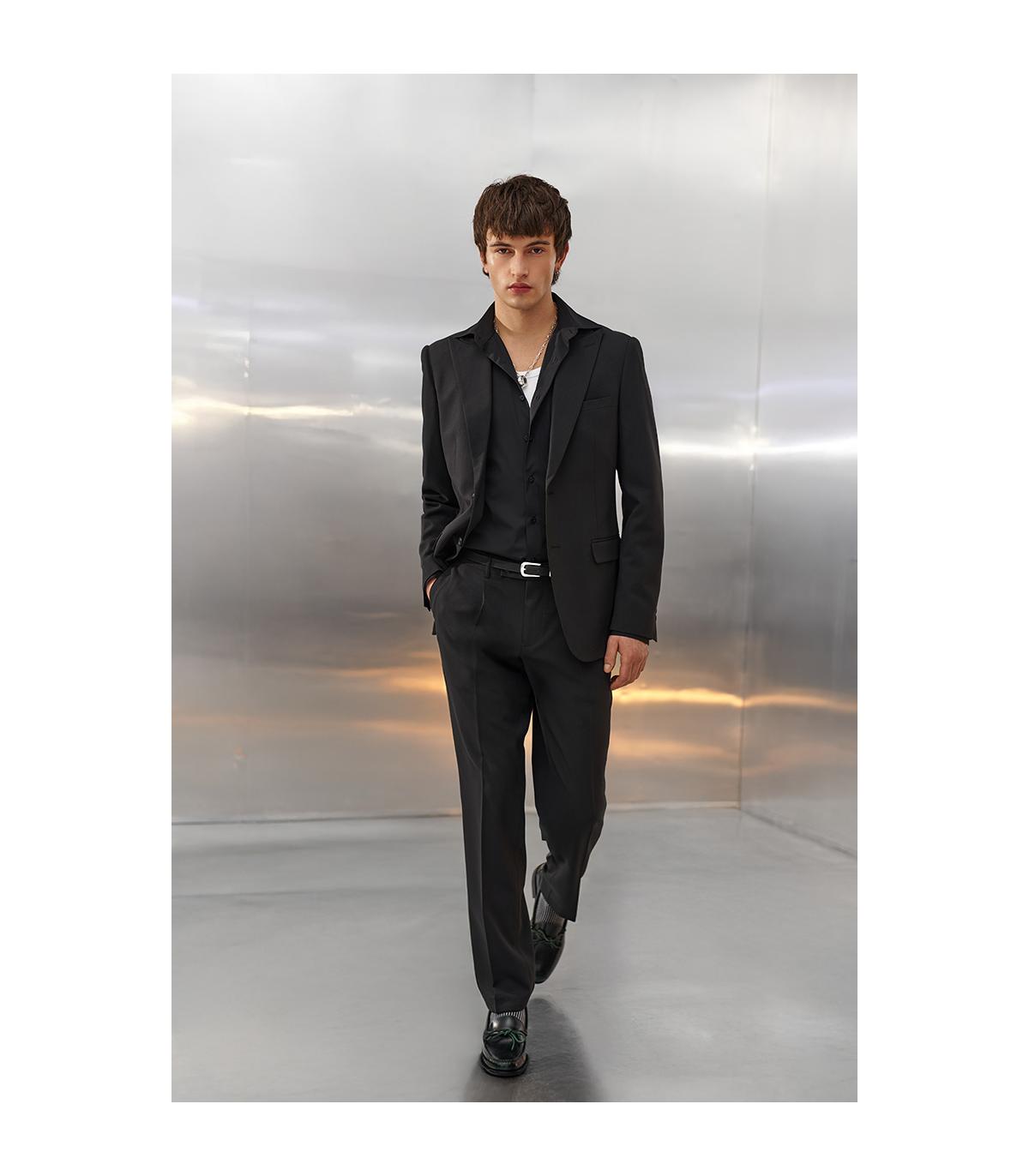 Marynarka tworzy spójny, wygodny i nowoczesny zestaw ze spodniami JACOB, które posiadają asymetryczny pasek i zakładki na przodzie, które nadają im nowoczesnego, lekko formalnego charakteru.