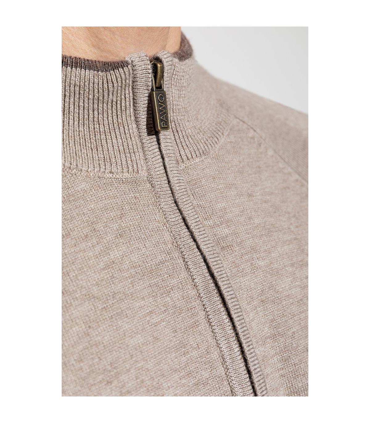 Beżowy sweter męski zapinany pod szyją typu troyer. Krótka stójka podkreślona brązowym kontrastowym kolorem, suwak metalowy z  logo PAWO. Sweter wykonany z trwałej przędzy z zawartością wełny. Miękki i ciepły sweter pasuje zarówno do t-shirtów jak i koszul. Dobrze wygląda zarówno z jeansami jak i spodniami casual. Sweter męski to praktyczny pomysł na prezent dla każdego mężczyzny. Do zapakowania na prezent można dokupić eleganckie pudełko z logo PAWO.